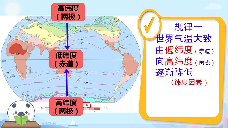 规律一世界气温大致由低纬度(赤道)向高纬度(两极)逐渐降低(纬度因素)