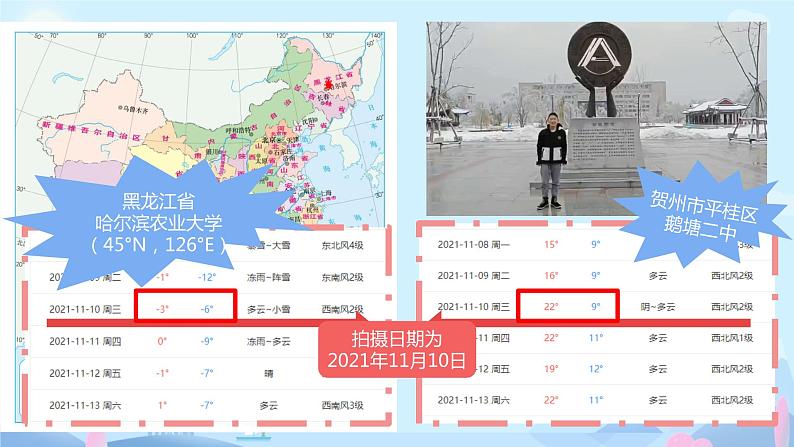 1.请同学们观察贺州和长津湖的纬度位置,并对比两地纬度与气温之间的关系;2.结合课本世界年平均气温分布图推断世界纬度与气温的相互关系。