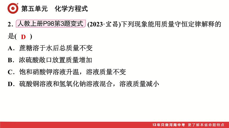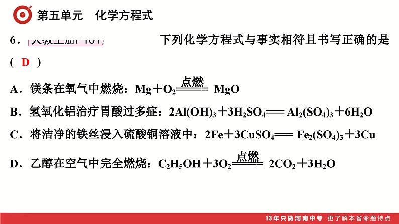 第5单元 化学方程式【考点串讲PPT】-2024年 中考化学考点大串讲(人教版): 这是一份第5单元 化学方程式【考点串讲PPT】-2024年 中考化学考点大串讲(人教版),共38页。PPT课件主要包含了中考化学一轮复习策略,化学方程式,第五单元,思维导图,考点01,ABD,考点02,考点03,考点04等内容,欢迎下载使用。