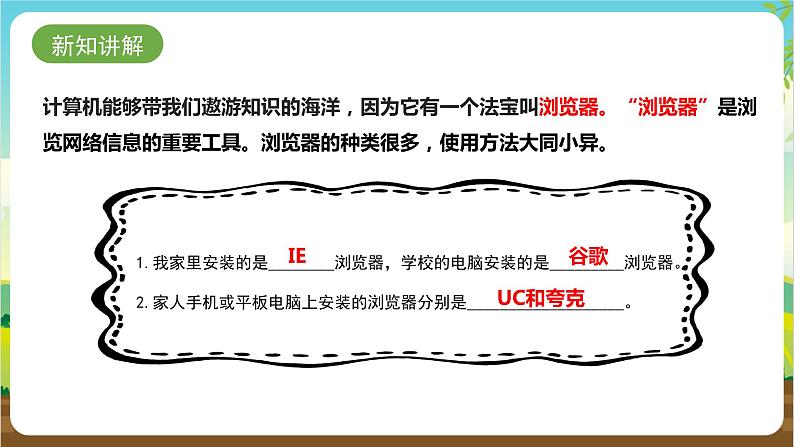 计算机能够带我们遨游知识的海洋,因为它有一个法宝叫浏览器。“浏览器”是浏览网络信息的重要工具。浏览器的种类很多,使用方法大同小异。