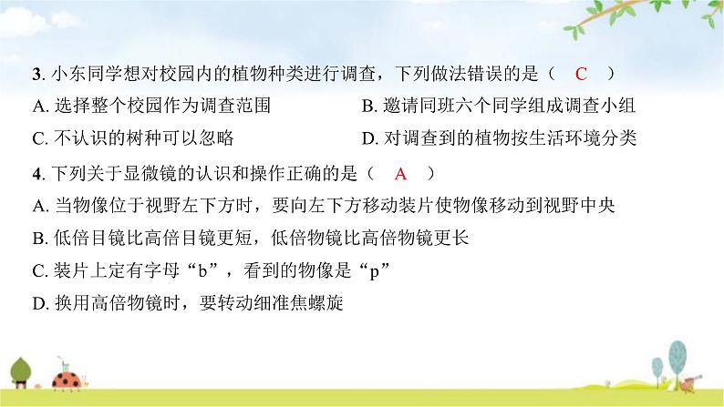 3. 小东同学想对校园内的植物种类进行调查,下列做法错误的是( C )