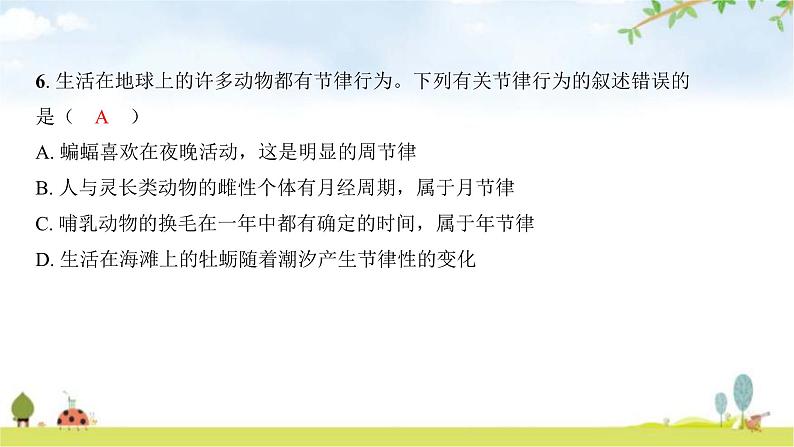 6. 生活在地球上的许多动物都有节律行为。下列有关节律行为的叙述错误的是( A )