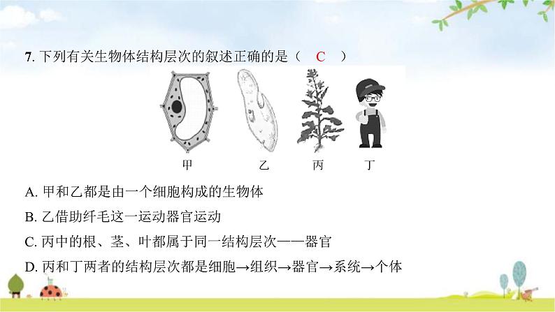 7. 下列有关生物体结构层次的叙述正确的是( C )