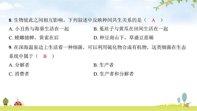 9. 在深海温泉边上生活着一种细菌,可以利用硫化物合成有机物,这类细菌在生态 系统中属于( B )