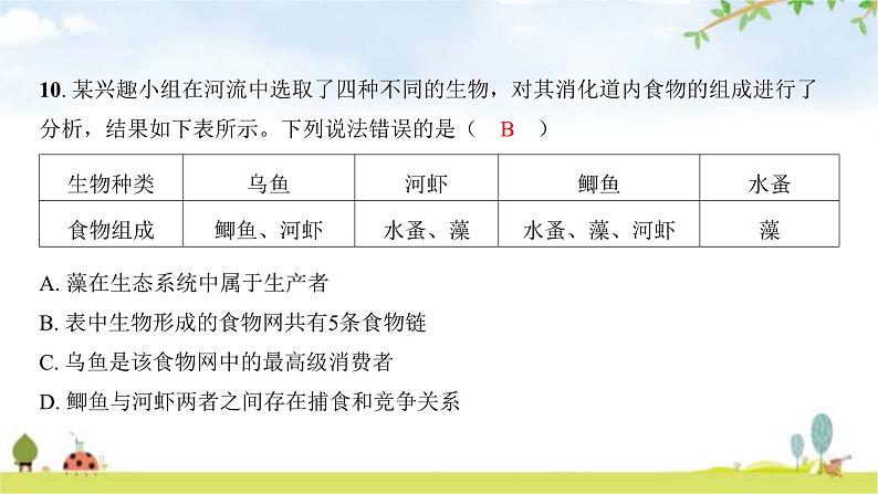 10. 某兴趣小组在河流中选取了四种不同的生物,对其消化道内食物的组成进行了 分析,结果如下表所示。下列说法错误的是( B )