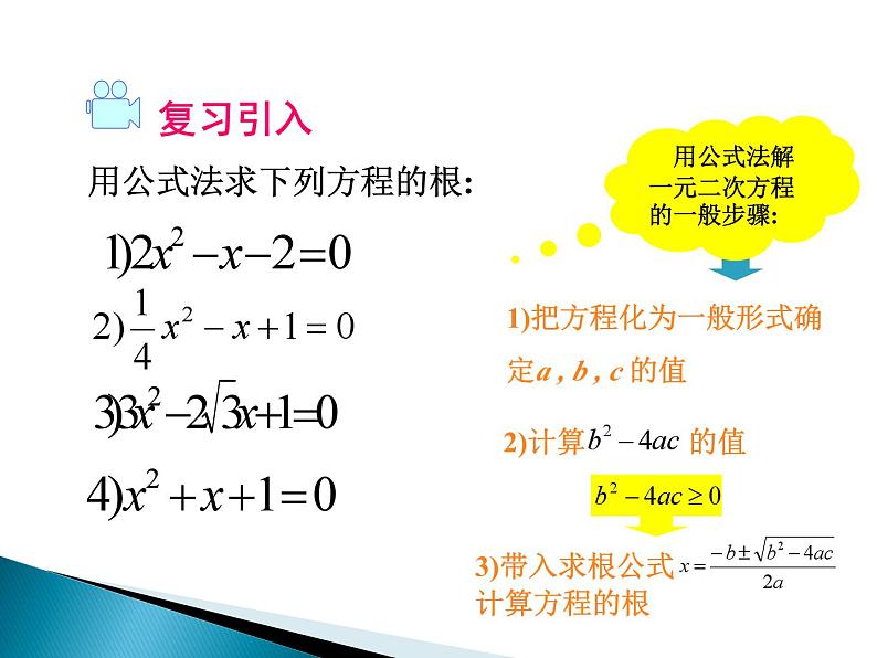 初中数学沪科版八年级下册17.1 一元二次方程示范课ppt课件: 这是一份初中数学沪科版八年级下册<a href="/sx/tb_c70395_t3/?tag_id=26" target="_blank">17.1 一元二次方程示范课ppt课件</a>,共14页。PPT课件主要包含了复习引入,温故而知新,配方法,合作探究,反之同样成立,方程有两个不相等的根,方程有两个相等的根,方程没有实数根,判别式与根,一般步骤等内容,欢迎下载使用。