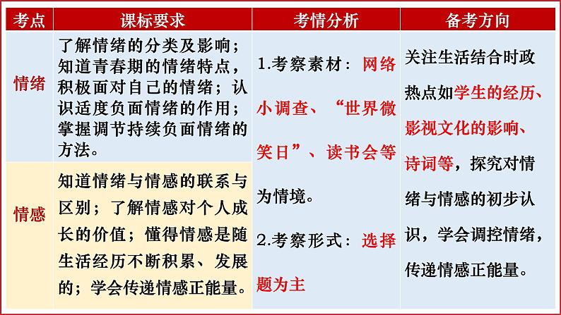这是一份七年级下册第二单元 做情绪情感的主人 复习课件 -2024年中考道德与法治一轮复习,共47页。PPT课件主要包含了核心考点一情绪,核心考点二情感等内容,欢迎下载使用。