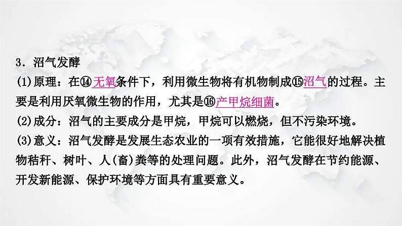 这是一份北师大版中考生物复习八年级下册第9单元生物技术第25章生物技术课件,共19页。PPT课件主要包含了微生物,现代生物,乳酸菌,曲霉和毛霉,酵母菌,米曲霉,蛋白质,产甲烷细菌,DNA,转基因技术等内容,欢迎下载使用。