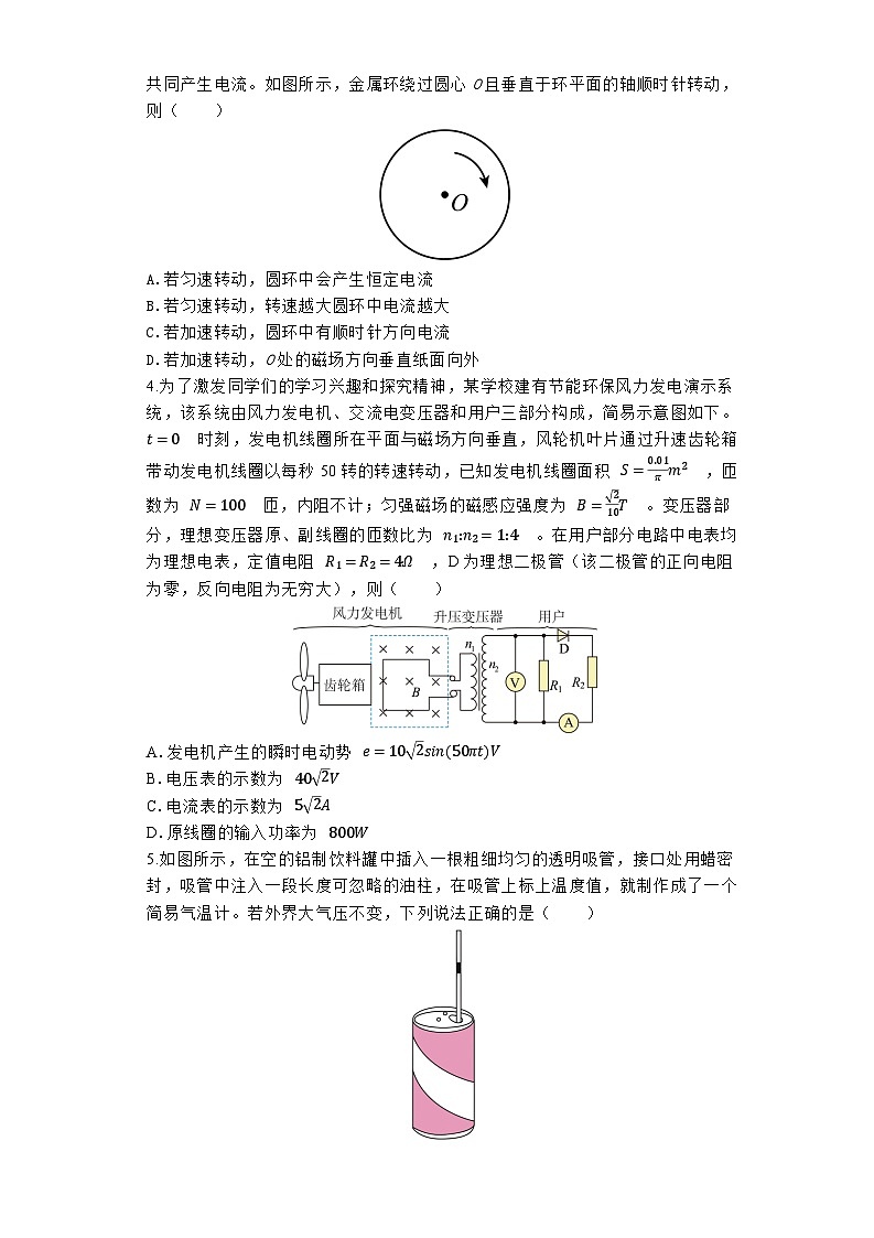 3.1917年斯泰瓦和托尔曼发现加速转动的金属环中产生了电流。正离子被金属晶格束缚相对金属环静止,而电子由于惯性相对金属环运动,正离子和电子的运动共同产生电流。如图所示,金属环绕过圆心O且垂直于环平面的轴顺时针转动,则( )