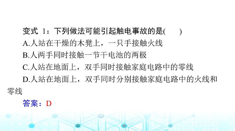 这是一份人教版九年级全册第3节 安全用电作业课件ppt,共17页。PPT课件主要包含了另一条腿,电源开关,用电器,绝缘皮,使用寿命等内容,欢迎下载使用。