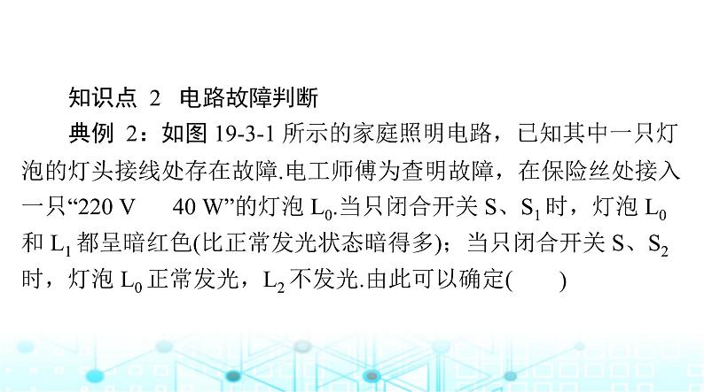 知识点 2 电路故障判断典例 2:如图 19-3-1 所示的家庭照明电路,已知其中一只灯泡的灯头接线处存在故障.电工师傅为查明故障,在保险丝处接入
