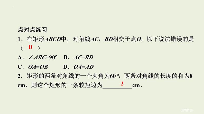 点对点练习 1.在矩形ABCD中,对角线AC,BD相交于点O,以下说法错误的是( )A.∠ABC=90°B.AC=BDC.OA=OB D.OA=AD2.矩形的两条对角线的一个夹角为60°,两条对角线的长度的和为8 cm,则这个矩形的一条较短边为__________cm.