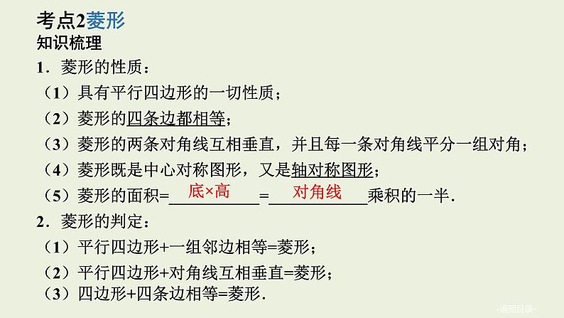 这是一份中考数学一轮复习 课件 第27课 矩形和菱形,共23页。PPT课件主要包含了思维导图,夯实基础,考点1矩形,底×高,对角线,考点2菱形,中考演练,分层达标,ABAD等内容,欢迎下载使用。