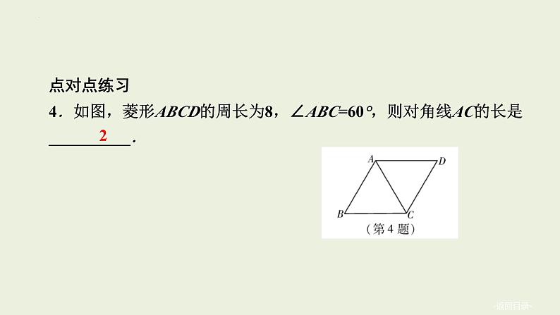 点对点练习 4.如图,菱形ABCD的周长为8,∠ABC=60°,则对角线AC的长是__________.