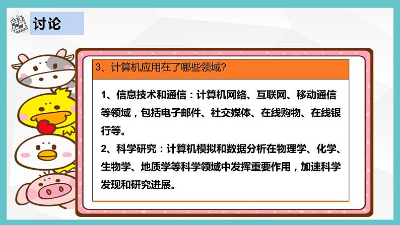 1、信息技术和通信:计算机网络、互联网、移动通信等领域,包括电子邮件、社交媒体、在线购物、在线银行等。2、科学研究:计算机模拟和数据分析在物理学、化学、生物学、地质学等科学领域中发挥重要作用,加速科学发现和研究进展。
