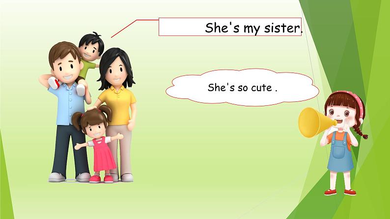 小组合作组内分工,采取一问一答的形式,让大家了解你的家庭成员。A:Wh's that?B:She's/He's my...