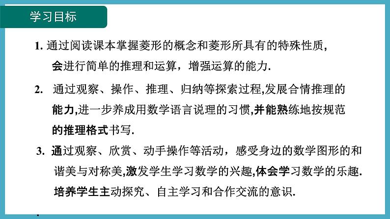 展开1. 通过阅读课本掌握菱形的概念和菱形所具有的特殊性质,会进行简单的推理和运算,增强运算的能力.