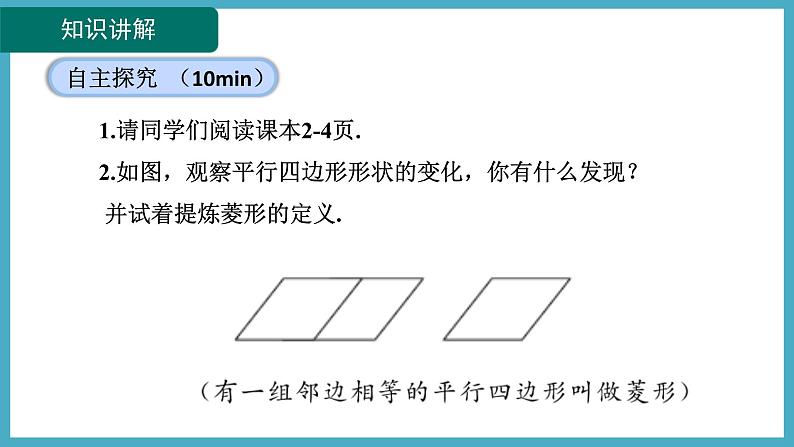 1.请同学们阅读课本2-4页.2.如图,观察平行四边形形状的变化,你有什么发现? 并试着提炼菱形的定义.