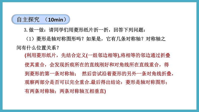 3.做一做:请同学们用菱形纸片折一折,回答下列问题: (1)菱形是轴对称图形吗?如果是,它有几条对称轴?对称轴之间有什么位置关系?