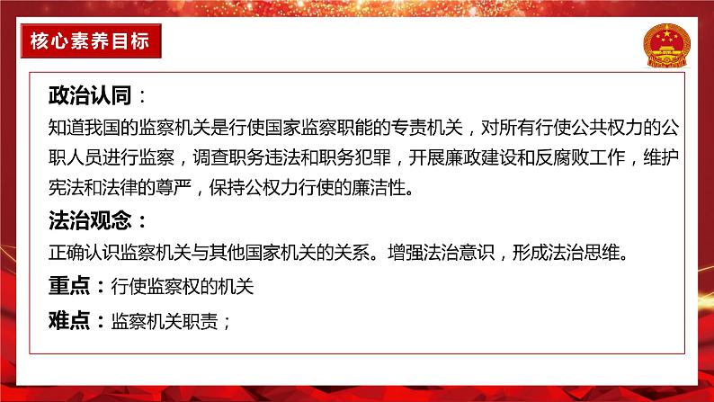 人教部编版第三单元 人民当家作主第六课 我国国家机构国家监察机关评课ppt课件: 这是一份人教部编版<a href="/zz/tb_c158950_t3/?tag_id=26" target="_blank">第三单元 人民当家作主第六课 我国国家机构国家监察机关评课ppt课件</a>,共24页。PPT课件主要包含了核心素养目标,学习目标,行使监察权的机关,监察机关的职责等内容,欢迎下载使用。