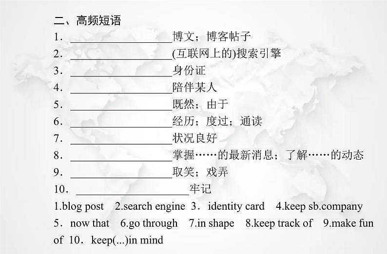 二、高频短语1.__________________博文;博客帖子2.__________________(互联网上的)搜索引擎3.__________________身份证4.__________________陪伴某人5.__________________既然;由于6.__________________经历;度过;通读7.__________________状况良好8.__________________掌握……的最新消息;了解……的动态9.__________________取笑;戏弄10.____________________牢记1.blg pst 2.search engine 3.identity card 4.keep sb.cmpany5.nw that 6.g thrugh 7.in shape 8.keep track f 9.make fun f 10.keep(...)in mind