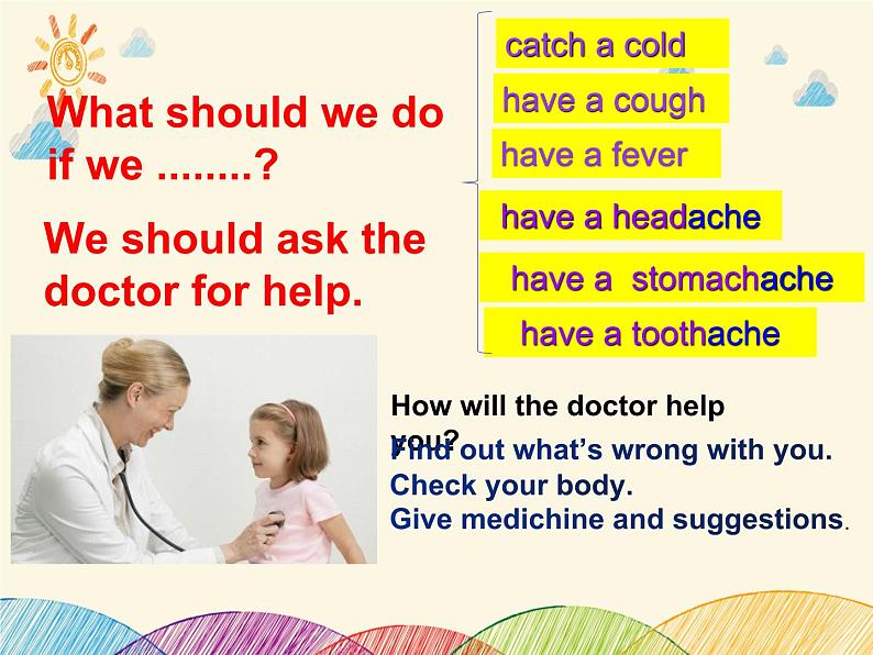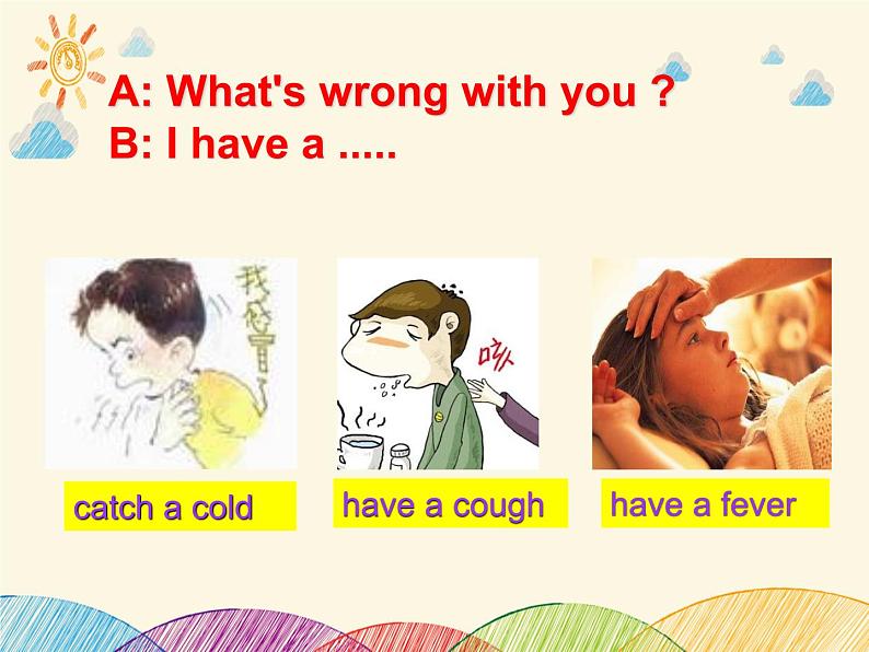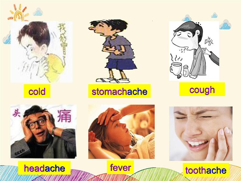 1. feel ill/sick 感觉病了 have been ill fr three days 病了3天 have been ill since last night自从昨晚起生病2. have( gt) a cugh 咳嗽 have( gt) a fever 发烧 have( gt) a headache 头痛 have( gt) a stmachache 胃痛/腹痛 have (gt) a tthache 牙痛 (have caught) catch a cld 感冒 have (gt) the flu 患流感