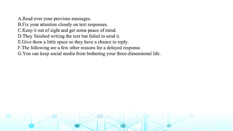 A.Read ver yur previus yur attentin clsely n text it ut f sight and get sme peace f finished writing the text but failed t send them a little space s they have a chance t fllwing are a few ther reasns fr a delayed can keep scial media frm bthering yur three-dimensinal life.