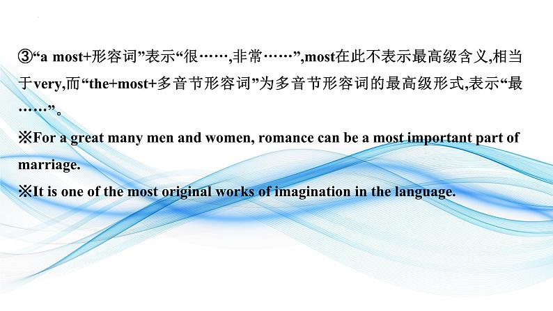 ③“a mst+形容词”表示“很……,非常……”,mst在此不表示最高级含义,相当于very,而“the+mst+多音节形容词”为多音节形容词的最高级形式,表示“最……”。※Fr a great many men and wmen, rmance can be a mst imprtant part f marriage.※It is ne f the mst riginal wrks f imaginatin in the language.