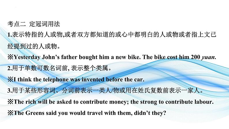 考点二 定冠词用法1.表示特指的人或物,或者双方都知道的或心中都明白的人或物或者指上文已经提到过的人或物。※Yesterday Jhn’s father bught him a new bike. The bike cst him 200 yuan.2.用于单数可数名词前, 表示整个类属。※I think the telephne was invented befre the car. 3.用于某些形容词、分词前表示一类人/物或用在姓氏复数前表示一家人。※The rich will be asked t cntribute mney; the strng t cntribute labur. ※The Greens said yu wuld travel with them, didn’t they?