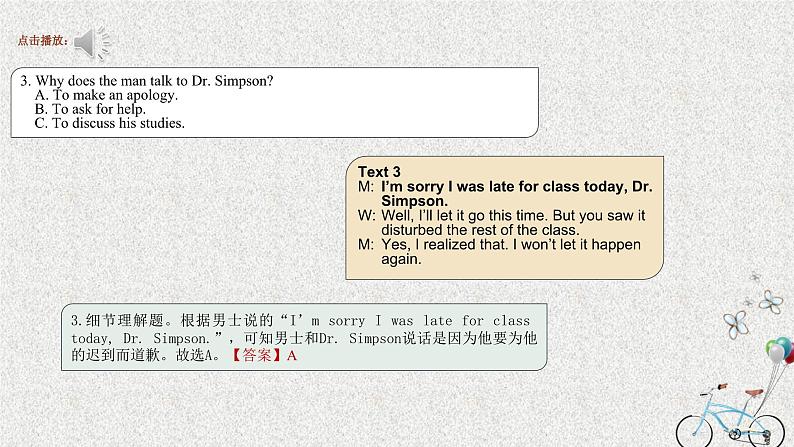 3.细节理解题。根据男士说的“I’m srry I was late fr class tday, Dr. Simpsn.”,可知男士和Dr. Simpsn说话是因为他要为他的迟到而道歉。故选A。【答案】A
