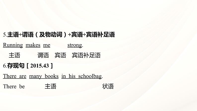 5.主语+谓语(及物动词)+宾语+宾语补足语Running makes me strng. 主语 谓语 宾语 宾语补足语