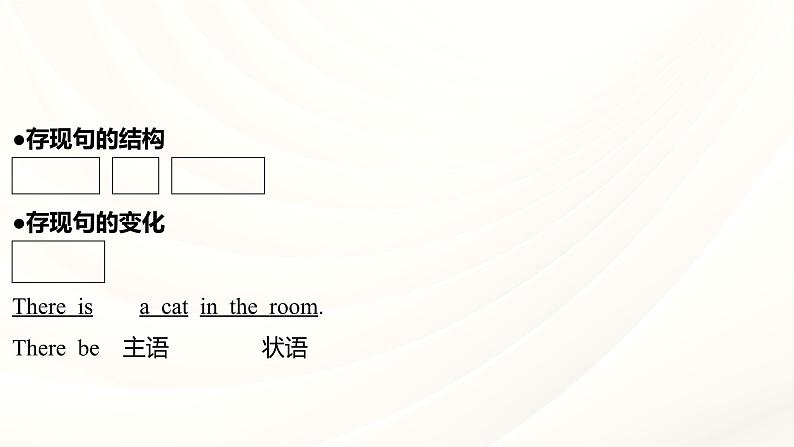 ●存现句的变化肯定句式There is a cat in the rm.There be 主语 状语