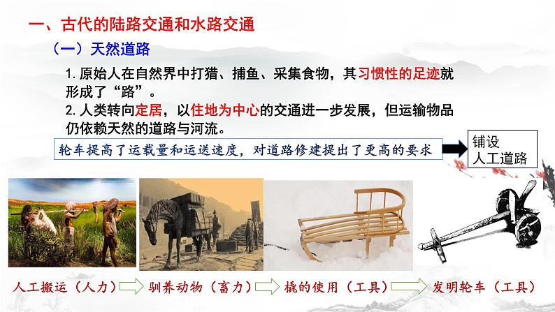1.原始人在自然界中打猎、捕鱼、采集食物,其习惯性的足迹就形成了“路”。2.人类转向定居,以住地为中心的交通进一步发展,但运输物品仍依赖天然的道路与河流。
