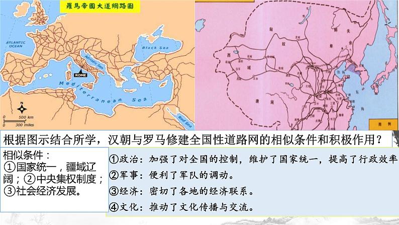 根据图示结合所学,汉朝与罗马修建全国性道路网的相似条件和积极作用?