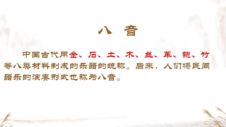 展开学习目标 1.初步认识了解八音及其代表乐器。 2.通过欣赏民族乐曲片段,正确听辨常见民族乐器的音色,加强文 化修养,丰富学习音乐的深度和广度。 3.增强民族自豪感,建立对民族文化的良好态度。