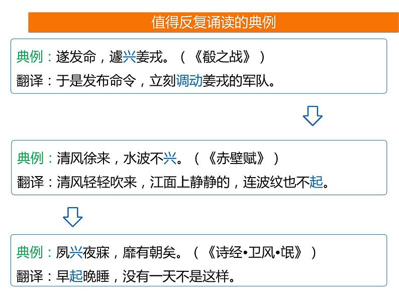 典例:清风徐来,水波不兴。(《赤壁赋》)翻译:清风轻轻吹来,江面上静静的,连波纹也不起。