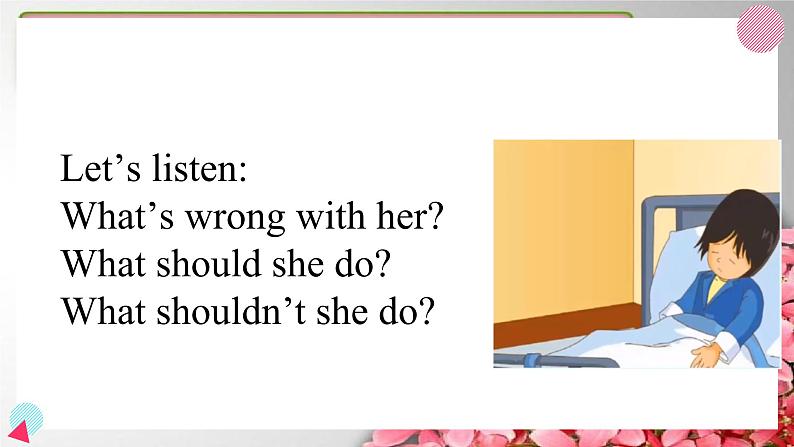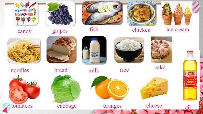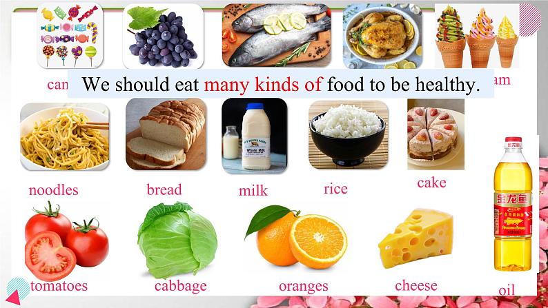 Unit 1 Keep healthyTimeFunLet’s listen:What’s wrong with her?What should she do?What shouldn’t she do?candygrapesfishchickennoodlesbreadmilkricetomatoescabbageorangescheeseoilice creamcakeWe should eat many kinds of food to be healthy. What's missing?candygrapesfishchickennoodlesbreadmilkricetomatoescabbageorangescheeseoilice creamcakefat and sugargrapeschickennoodlesbreadmilkricetomatoescabbageorangescheesefishmeat and fishbeefporkgrapesnoodlesbreadmilkricetomatoescabbageorangescheesefruitnoodlesbreadmilkricetomatoescabbagecheesemilk and dairy products(奶制品)yogurtnoodlesbreadricetomatoescabbagevegetablesnoodlesbreadricegrains porridgedumplingsa little一点some一些plenty of大量a lot of许多a little一点some一些plenty of大量a lot of许多I like ice cream, so I eat plenty of them.a little一点some一些plenty of大量a lot of许多 I like fish, so I eat a lot of them.a little一点some一些plenty of大量a lot of许多 I don't like vegetables, so I eat a little of them.a little一点some一些plenty of大量a lot of许多 I like fruit, so I eat a lot of them.food pyramid食物金字塔What should we eat? What shouldn’t we eat? How much should we eat? a little一点What food should we eat a little?a little一点We should ______________________.We shouldn’t _______________________.eat a little fat and sugareat too much fat and sugarhave a toothachebe fata little一点What food should we eat some?some一些a little一点We should ______________________.We should _____________________________.eat some meat and fishhave some milk and dairy productssome一些a little一点What food should we eat plenty?some一些What food should we eat a lot?plenty of大量a lot of许多a little一点We should _____________________________.eat plenty of fruit and vegetablesplenty of大量some一些a little一点plenty of大量some一些a lot of许多We should ___________________________eat a lot of grains, such as rice, bread and noodles.We should ______________________.We shouldn’t _______________________.eat a little fat and sugareat too much fat and sugarWe should ______________________.We should _____________________________.eat some meat and fishhave some milk and dairy productsWe should _____________________________.eat plenty of fruit and vegetablesWe should ___________________________eat a lot of grains, such as rice, bread and noodles.We should eat many kinds of food to be healthy. fruit andvegetablesfish and meatfat and sugarmilk and dairy productsgrainsDon’t be picky about your food.(不能挑食)
