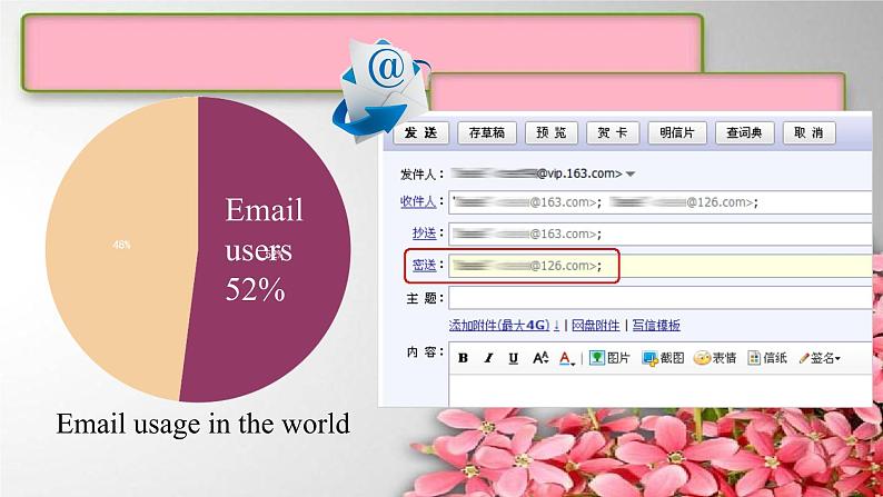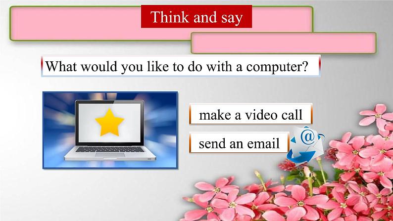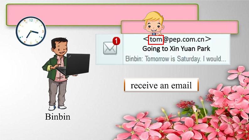 Unit 3 Making ContactContact by EmailLesson 3Think and sayWhat would you like to do with a pen and paper? write a letterThink and sayWhat would you like to do in a post office? mail a presentsend a cardsend a letterThink and sayWhat would you like to do with a cellphone? make a video callsend a short messagemake a phone callThink and sayWhat would you like to do with a computer? send an emailmake a video callEmail users 52%Email usage in the worldLesson 3Contact by EmailBinbinreceive an email收件箱headerSubjectEmail adressatdotdotWhat do you know from the header? headerSubjectEmail adressatdotdotTimebodyinvitationinvitationWhat would Tom like to do in the park?ReadWhat’s Bill’s favorite special day?What would he like to do on that day? Teacher’s Daybuy some flowersmake a cardmake a phone call= make a phone call to herYes, I’d like to.No, thanks.Teacher’s Daybuy some flowersmake a cardmake a phone callYes, I’d like to.No, thanks.ReportTeacher’s Daybuy some flowersmake a cardmake a phone call______’s favorite special day is ________.He/She would like to __________.Spring FestivalI would like to meet up with my parents, set off fireworks and say “Happy New Year” to everyone on Spring Festival. Can Binbin go with them on Saturday?Greeting 问候Purpose 目的Details 细节Ending 结语Closing 落款Greeting 问候Purpose 目的Details 细节Ending 结语Closing 落款Thank you for inviting me.Dear Tom,Yours,BinbinI looking forward to seeing you.SThank you for inviting me.Dear Tom,Yours,BinbinI looking forward to seeing you.SGreeting 问候Purpose 目的Details 细节Ending 结语Closing 落款问候目的细节结语落款Let’s writeGreeting 问候Purpose 目的Details 细节Ending 结语Closing 落款 (目的)Weekend is coming. My family and I would like to go out to have fun. Would you like to go with us? (结语)Would you like to come? Wait for your reply. 参考句子(不算入五句):Let’s writeWe would like to ___________ on Saturday morning. On Saturday afternoon, we would like to ________.(按上面两句再仿写出两句星期天Sunday的)We would like to go to the bookshop on Saturday. I can read many interesting books there with my mum. We would like to go to the sports park on Sunday. I can play fun sports there with my father. whowhenwherewhatY组T组