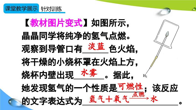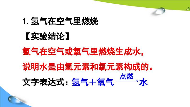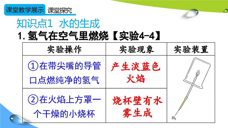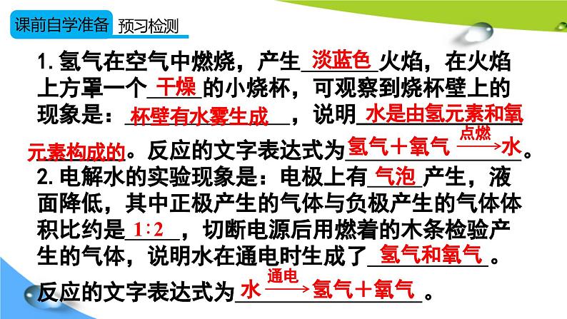 实验活动2水的组成及变化的探究R·九年级化学上册第四单元 水的组成学习目标1.认识水的组成。2.了解水在通电条件下发生的变化,进一步认识分解反应。3.进一步体会科学探究的过程和方法。实验用品:水电解器、烧杯、带尖嘴的玻璃导管、直流电源、铁架台(带滴定夹)、酒精灯、弹簧夹、导线、木条、火柴、硫酸钠溶液(或氢氧化钠溶液)。1.氢气在空气中燃烧,产生 火焰,在火焰上方罩一个 的小烧杯,可观察到烧杯壁上的现象是: ,说明_______________________。反应的文字表达式为 。2.电解水的实验现象是:电极上有 产生,液面降低,其中正极产生的气体与负极产生的气体体积比约是 ,切断电源后用燃着的木条检验产生的气体,说明水在通电时生成了 。反应的文字表达式为 。干燥淡蓝色杯壁有水雾生成水是由氢元素和氧元素构成的1∶2气泡氢气和氧气1.氢气在空气里燃烧【实验4-4】知识点1 水的生成产生淡蓝色火焰烧杯壁有水雾生成1.氢气在空气里燃烧【实验结论】氢气在空气或氧气里燃烧生成水,说明水是由氢元素和氧元素构成的。文字表达式:【注意事项】点燃氢气前一定要检验其纯度验纯方法:收集一试管氢气,用拇指堵住,靠近火焰,移开拇指,发出尖锐爆鸣声,说明氢气不纯,声音很小则表示氢气较纯。【教材图片变式】如图所示,晶晶同学将纯净的氢气点燃。观察到导管口有 色火焰,将干燥的小烧杯罩在火焰上方,烧杯内壁出现 。据此,她发现氢气的一个性质是 ;该反应的文字表达式为 。淡蓝水雾可燃性知识点2 水的分解1.电解水实验【实验步骤】①在电解器玻璃管中加满水(水中加入少量硫酸钠溶液或氢氧化钠溶液),用导线连接电解器与电源。②接通直流电源,观察两个电极附近和玻璃管内发生的变化,记录实验现象。③切断上述装置中的电源,用燃着的木条分别在两个玻璃管尖嘴口检验反应中产生的气体。【装置及现象分析】【实验结论】水通电发生分解反应,生成氢气和氧气,且氢气和氧气的体积比约为2:1。反应文字表达式为:【注意事项】①实验前应检查装置气密性,同时保证装置不漏水。②检验气体时缓慢转动活塞,使气体慢慢放出。③为便于观察,可在水中加入红色素(不发生反应)【问题与交流】1.水在通电时发生了什么变化?生成了哪几种物质?水在通电时发生了分解反应,生成了氢气和氧气。2.哪些证据可以证明水是由氢、氧两种元素组成的?氢气的燃烧和水的分解两个反应都可以证明水是由氢、氧两种元素组成的。氢气的燃烧:H2O2水的分解:H2O2氢气由氢元素组成,氧气由氧元素组成,化学变化前后元素的种类不变,因此两个反应都能证明水由氢、氧两种元素组成。1.用如图所示装置电解水,下列说法错误的是( ) A.实验说明水由氢气和氧气组成 B.水中可加入少量硫酸钠或氢氧化 钠溶液以增强导电性 C.将带火星的木条放在M导管口处, 木条会复燃 D.N处收集的气体靠近火焰,若发 出尖锐的爆鸣声,说明不纯A2.某实验小组用如图所示装置完成电解水的实验并收集产生的气体。①a是电源的 极,c管中收集到的气体是 ,其密度比空气的 。②除了水的电解实验, 的实验也可证明水的组成。负氢气小氢气在氧气中燃烧3.在宏观、微观、符号和模型之间建立联系是化学特有的思维方式。根据电解水实验,回答下列问题。(1)宏观辨识:如图甲所示,氧气和氢气的体积比约为 。1:2(2)微观探析:下列说法正确的是_______ (填字母)。 A.水是由水分子构成的 B.水是由氢原子和氧原子组成的 C.水由氢分子和氧原子构成 D.每个水分子由2个氢原子和1个氧原子构成AD(3)符号表示:电解水的化学符号表达式为 。(4)模型认知:在图乙中填充反应的微观示意图。实验活动2 水的组成及变化的探究①②氢气在氧气中燃烧、电解水两组实验均可证明水由氢、氧两种元素组成。1.从课后习题中选取;2.完成练习册本课时的习题。