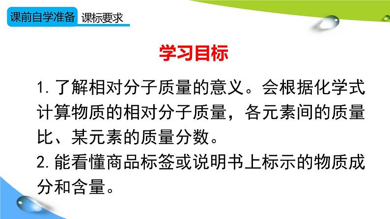 1.了解相对分子质量的意义。会根据化学式计算物质的相对分子质量,各元素间的质量比、某元素的质量分数。2.能看懂商品标签或说明书上标示的物质成分和含量。