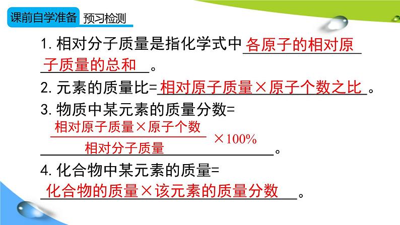 这是一份初中化学课题3 水的组成课前预习课件ppt,文件包含第3课时物质组成的定量认识有关化学式的计算pptx、有关相对分子质量的计算mp4等2份课件配套教学资源,其中PPT共28页, 欢迎下载使用。