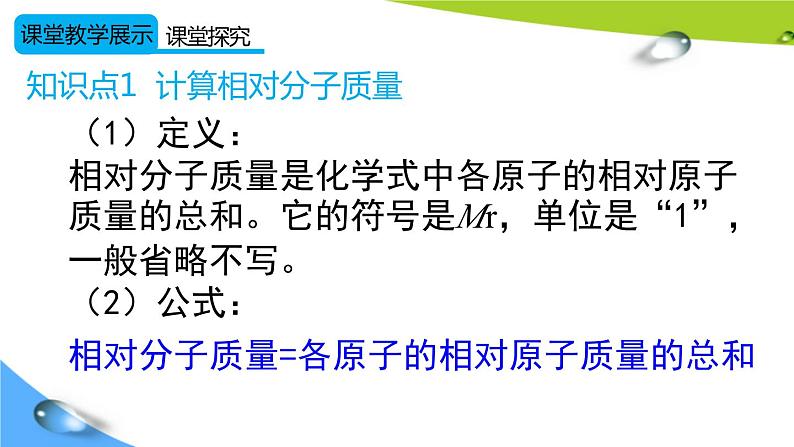 (1)定义:相对分子质量是化学式中各原子的相对原子质量的总和。它的符号是Mr,单位是“1”,一般省略不写。(2)公式: