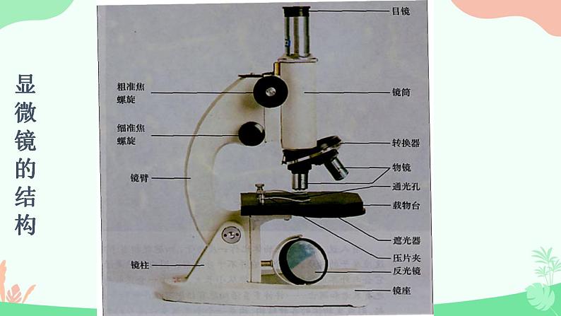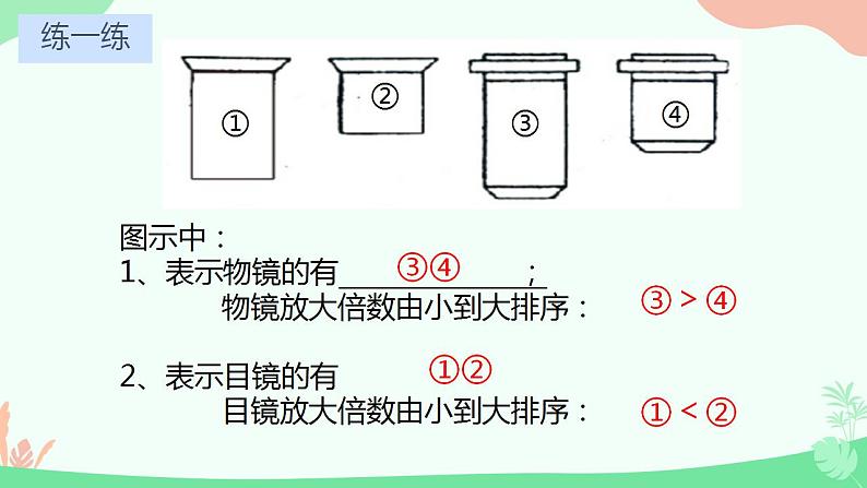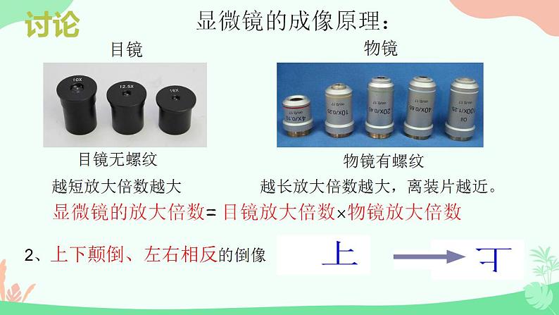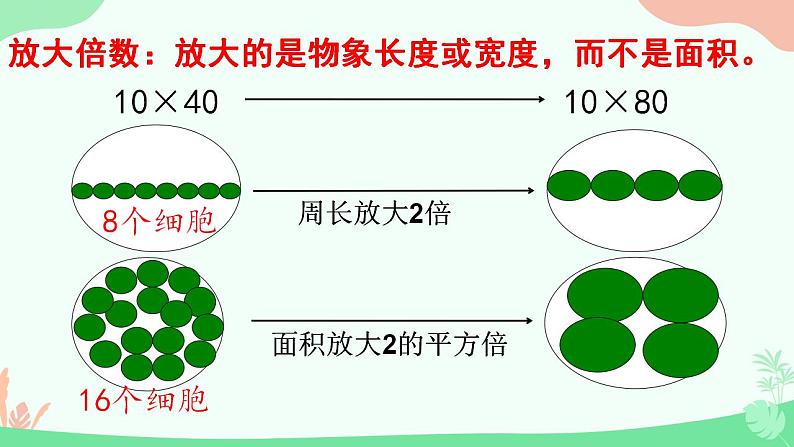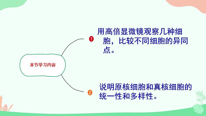 第1章 走近细胞第2节 细胞的多样性和统一性用高倍显微镜观察几种细胞,比较不同细胞的异同点。说明原核细胞和真核细胞的统一性和多样性。 口腔上皮细胞正在分裂的植物细胞 人血细胞 洋葱表皮细胞问题探讨观察下列细胞1.上图细胞有哪些共同的结构?细胞膜、细胞核、细胞质2.不同种类细胞的形态结构不同的原因?细胞分化的结果统一性差异性显微镜的结构讨论显微镜的成像原理:2、上下颠倒、左右相反的倒像目镜物镜目镜无螺纹物镜有螺纹越短放大倍数越大越长放大倍数越大,离装片越近。显微镜的放大倍数=目镜放大倍数×物镜放大倍数放大倍数:放大的是物象长度或宽度,而不是面积。10×80面积放大2的平方倍8个细胞16个细胞图示中:1、表示物镜的有 ; 物镜放大倍数由小到大排序:2、表示目镜的有 目镜放大倍数由小到大排序:练一练③④③>④①②①<②显微镜的结构遮光器:上有光圈,用于调节光线强弱。要将视野调亮,换用大光圈,要将视野调暗,换小光圈反光镜: 平面镜:散光,强光时用,用于调弱光线 凹面镜:聚光,弱光时用,用于增强光线粗准焦螺旋:转动时,镜筒升降范围较大细准焦螺旋:转动时,镜筒升降范围较小显微镜的使用方法先低后高(1)低倍镜观察:取镜——安放——对光——压片——调焦——观察;(2)高倍镜观察:找(在低倍镜下找到目标)——移(移动装片,使目标位于视野中央)——转(转动转换器,换用高倍镜)——调(调节光圈,使视野亮度适宜;调节细准焦螺旋,找到清晰物像) 高倍镜与低倍镜下物象和视野的区别大小大小少多暗亮视野中异物位置的判断 视野中异物的位置一般有三种可能——载玻片的标本上、目镜上、物镜上。判断方法如下:移动装片是不是所有细胞都具有细胞膜、细胞质和细胞核这三个结构呢?观察下面的两幅图片:原核生物与真核生物的分类依据:科学家根据细胞内有无以核膜为界限的细胞核,把细胞分为原核细胞和真核细胞。P10细菌蓝细菌放线菌衣原体支原体(1)细菌生活方式绝大多数种类是营腐生或寄生生活, 一般为异养生物但是也有自养生物、如光合细菌、硝化细菌。鞭毛细胞壁细胞膜拟核核糖体细胞壁细胞膜细胞质拟核:鞭毛纤毛细胞质基质核糖体质粒由肽聚糖构成合成蛋白质无染色体、裸露环状DNA分子小型环状DNA特殊结构:荚膜纤毛常见的原核生物菌的前面有“杆”、“球”、“弧”、“螺旋”的都是细菌,其细胞壁的成分是肽聚糖。结构判断 3.常见的原核生物小技巧:凡是“菌”前面有“杆”“球”“螺旋”“弧”都是细菌。色球蓝细菌、颤蓝细菌、念珠蓝细菌、发菜细胞内无叶绿体,含有藻蓝素和叶绿素,能进行光合作用,代谢类型为自养需氧型生物。由肽聚糖构成蛋白质的合成场所细胞壁细胞膜细胞质拟核:细胞质基质核糖体含叶绿素藻蓝素可以进行光合作用无染色体,裸露环状DNA分子巧记方法:海边捡一串红色的球状念珠,发财了手都在颤抖啊!2.常见的原核生物(2)蓝细菌(蓝藻)种类结构生活方式 3.常见的原核生物【发菜】是一种野生蓝藻,通常生长于北方荒漠、半荒漠地区的草原、山坡或低洼地带。【念珠蓝细菌】别名地木耳、地皮菜、地软、地踏菜等。普通念珠蓝细菌是一种固氮蓝细菌。2分钟内自主阅读课本第10-11页内容,独立思考以下问题引起水华现象的罪魁祸首是什么,他以什么形式存在?引起水华现象的原因及危害是什么?蓝细菌(色球蓝细菌、念珠蓝细菌、颤蓝细菌等),细胞群体的形式存在。淡水水域污染、富营养化,导致蓝细菌大量繁生,影响水质和水生动物的生活。为什么蓝细菌细胞内无叶绿体也能进行光合作用?藻蓝素和叶绿素 光合作用 自养生物水华赤潮2分钟内自主阅读课本第10-11页内容,独立思考以下问题淡水水域污染,水体富营养化: 。海洋水域污染,水体富营养化: 。色球蓝细菌颤蓝细菌念珠蓝细菌群体存在现形式N、P等增多水体富营养化水华赤潮水华赤潮3.其他原核生物(1)支原体与细菌的细胞结构有什么区别?(2)支原体与动物细胞的结构有什么区别?没有核膜包被的细胞核,只有游离的DNA只有核糖体一种细胞器没有细胞壁由真核细胞构成的生物叫真核生物。特点:细胞中有以核膜为界限的细胞核植物动物真菌轮藻、黑藻草履虫、变形虫、绿眼虫酵母菌、霉菌(青、曲、毛、根)、食用菌绿藻:衣藻、团藻、小球藻、水绵红藻:紫菜褐藻:海带几个注意点原生生物≠原核生物原生生物是低等的单细胞真核生物,如草履虫、变形虫;酵母菌;衣藻单细胞生物≠原核生物原核生物都是单细胞生物,一个细胞就是一个个体单细胞生物不一定是原核生物,如单细胞的草履虫、变形虫、酵母菌等就是真核生物无以核膜为界限的细胞核无核膜、核仁、无染色体,有环状DNA分子较小(1-10um)多数有细胞壁(支原体除外)只有核糖体有以核膜为界限的真正细胞核有核膜、核仁、染色体(DNA+蛋白质 )较大(10-100um)植物、真菌有有核糖体等复杂细胞器①都具有细胞膜和细胞质(都具有细胞器核糖体)②都以DNA为遗传物质1、不属于真核生物的不一定就是原核生物。2、带“菌”的不一定都是细菌。3、原核生物不一定都有细胞壁。4、能进行光合作用的生物不一定都是植物。5、没有细胞核的细胞不一定就是原核生物。6、细菌不一定都是异养生物。7、单细胞生物不一定都是原核生物温馨提醒:原核细胞和真核