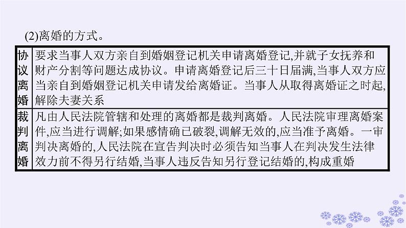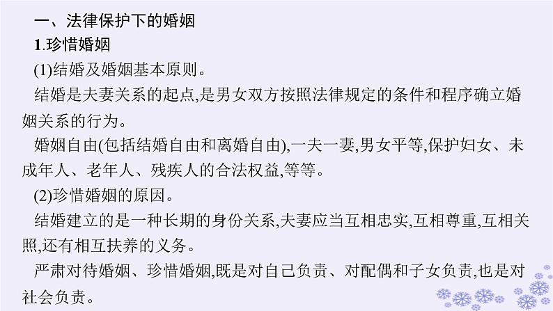 一、法律保护下的婚姻1.珍惜婚姻(1)结婚及婚姻基本原则。结婚是夫妻关系的起点,是男女双方按照法律规定的条件和程序确立婚姻关系的行为。婚姻自由(包括结婚自由和离婚自由),一夫一妻,男女平等,保护妇女、未成年人、老年人、残疾人的合法权益,等等。(2)珍惜婚姻的原因。结婚建立的是一种长期的身份关系,夫妻应当互相忠实,互相尊重,互相关照,还有相互扶养的义务。严肃对待婚姻、珍惜婚姻,既是对自己负责、对配偶和子女负责,也是对社会负责。
