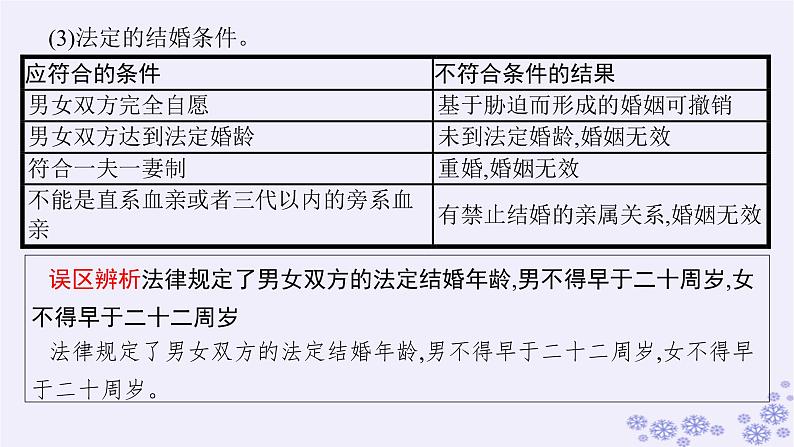 1.全面理解法律保护下的婚姻(1)合法的受保护的婚姻必须具备的条件。①要遵循结婚的基本原则:婚姻自由,一夫一妻,男女平等,保护妇女、未成年人、老年人、残疾人的合法权益。②要具备法定的结婚条件:男女双方完全自愿;男女双方达到法定婚龄;符合一夫一妻制;直系血亲或者三代以内的旁系血亲禁止结婚。③受法律保护的婚姻必须履行了法定的结婚登记程序。
