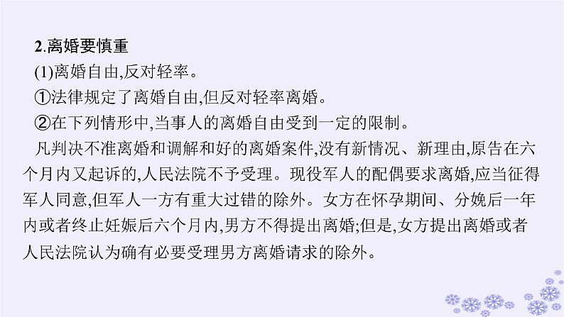 2.离婚要慎重(1)离婚自由,反对轻率。①法律规定了离婚自由,但反对轻率离婚。②在下列情形中,当事人的离婚自由受到一定的限制。凡判决不准离婚和调解和好的离婚案件,没有新情况、新理由,原告在六个月内又起诉的,人民法院不予受理。现役军人的配偶要求离婚,应当征得军人同意,但军人一方有重大过错的除外。女方在怀孕期间、分娩后一年内或者终止妊娠后六个月内,男方不得提出离婚;但是,女方提出离婚或者人民法院认为确有必要受理男方离婚请求的除外。