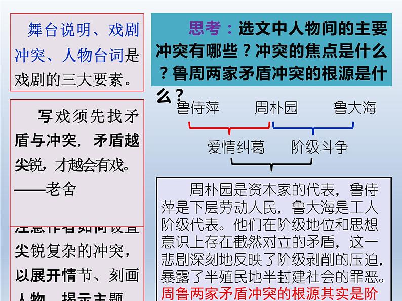 思考:选文中人物间的主要冲突有哪些?冲突的焦点是什么?鲁周两家矛盾冲突的根源是什么?