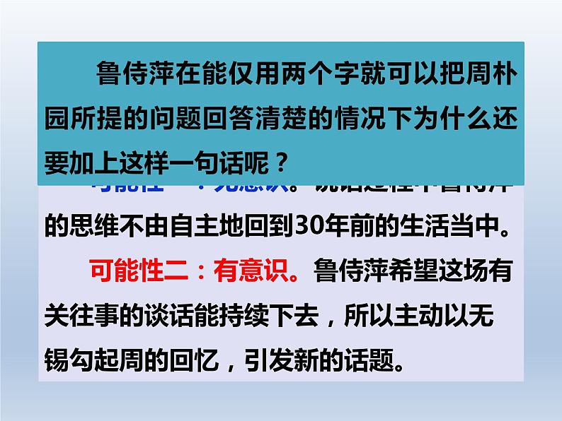 可能性一:无意识。说话过程中鲁侍萍的思维不由自主地回到30年前的生活当中。 可能性二:有意识。鲁侍萍希望这场有关往事的谈话能持续下去,所以主动以无锡勾起周的回忆,引发新的话题。