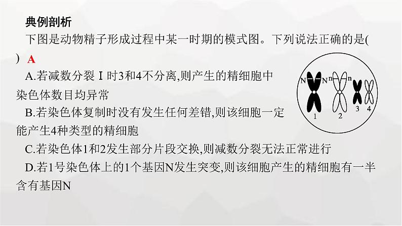 展开典例剖析下图是动物精子形成过程中某一时期的模式图。下列说法正确的是( )A.若减数分裂Ⅰ时3和4不分离,则产生的精细胞中染色体数目均异常B.若染色体复制时没有发生任何差错,则该细胞一定能产生4种类型的精细胞C.若染色体1和2发生部分片段交换,则减数分裂无法正常进行D.若1号染色体上的1个基因N发生突变,则该细胞产生的精细胞有一半含有基因N