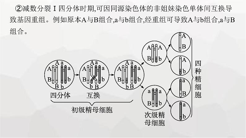 ②减数分裂Ⅰ四分体时期,可因同源染色体的非姐妹染色单体间互换导致基因重组。例如原本A与B组合,a与b组合,经重组可导致A与b组合,a与B组合。